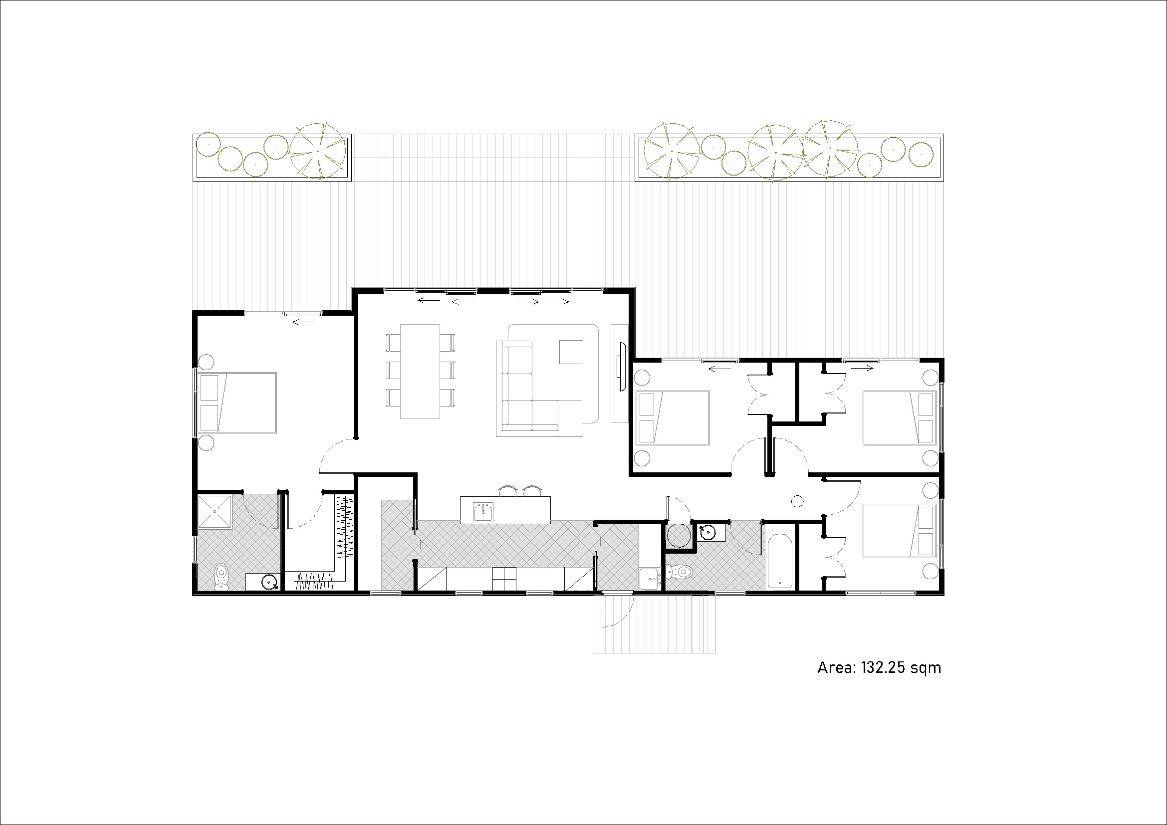Separate master with walk in wardrobe and ensuite on one end of the house and 3 bedrooms and bathroom on the other
